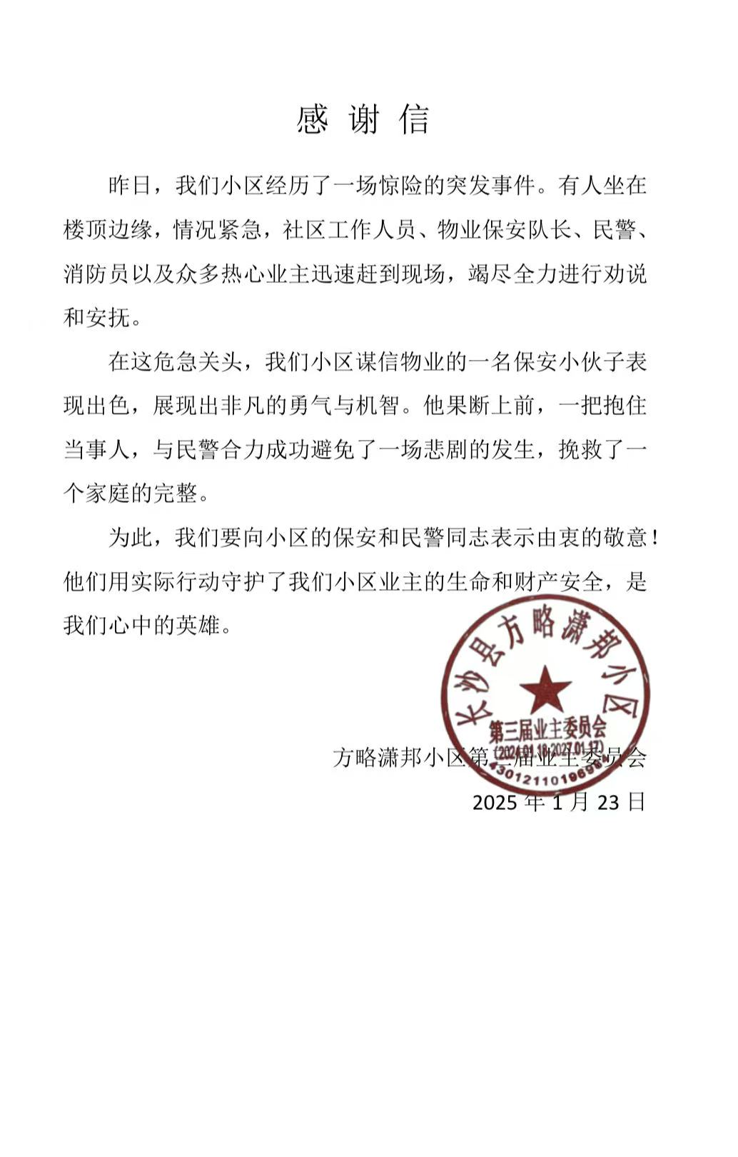 2025年1月21日18點(diǎn)35分左右,湖北領(lǐng)威保安公司湖南分公司駐方略瀟邦項(xiàng)目的隊(duì)長高云炳,在巡邏時(shí)接到了業(yè)主的通知,10棟2單元樓頂有一業(yè)主企圖跳樓輕生。